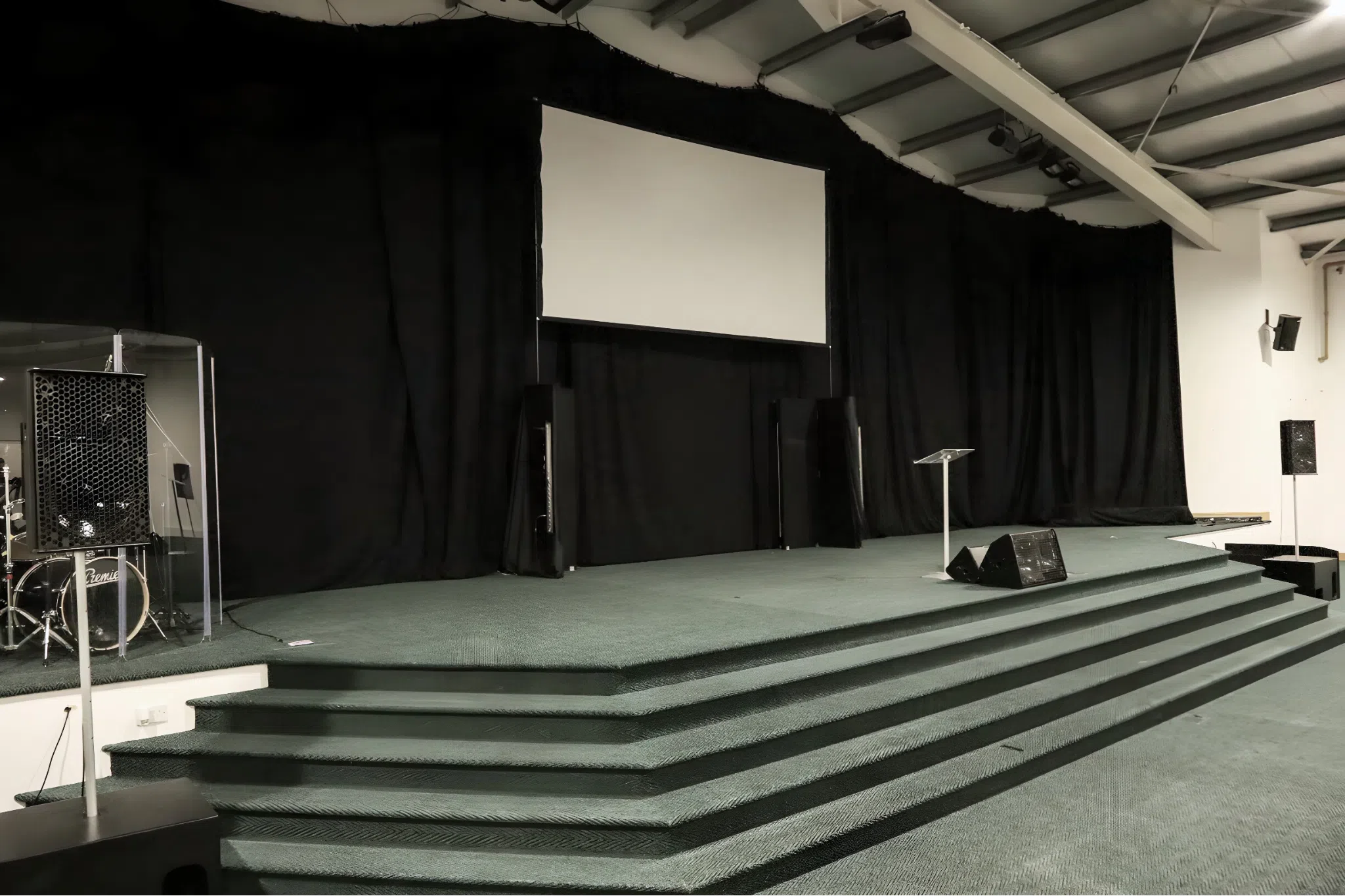 Stage Display: TV monitor facing stage for presenter notes or live feeds.